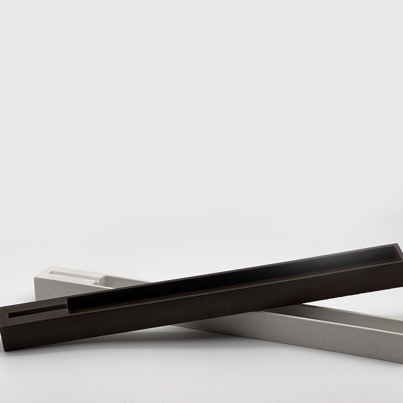 A long, slim channel of pigmented concrete. The stick rests inside, ash falls into the trough — nothing escapes the line. Cast in one piece, finished by hand.